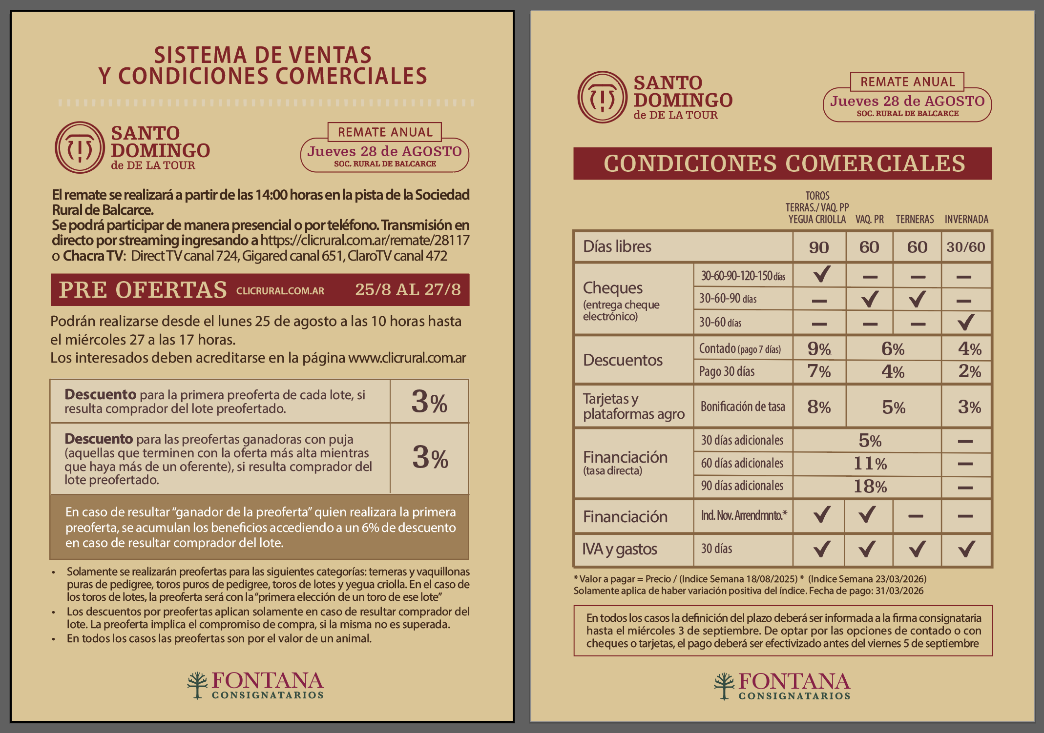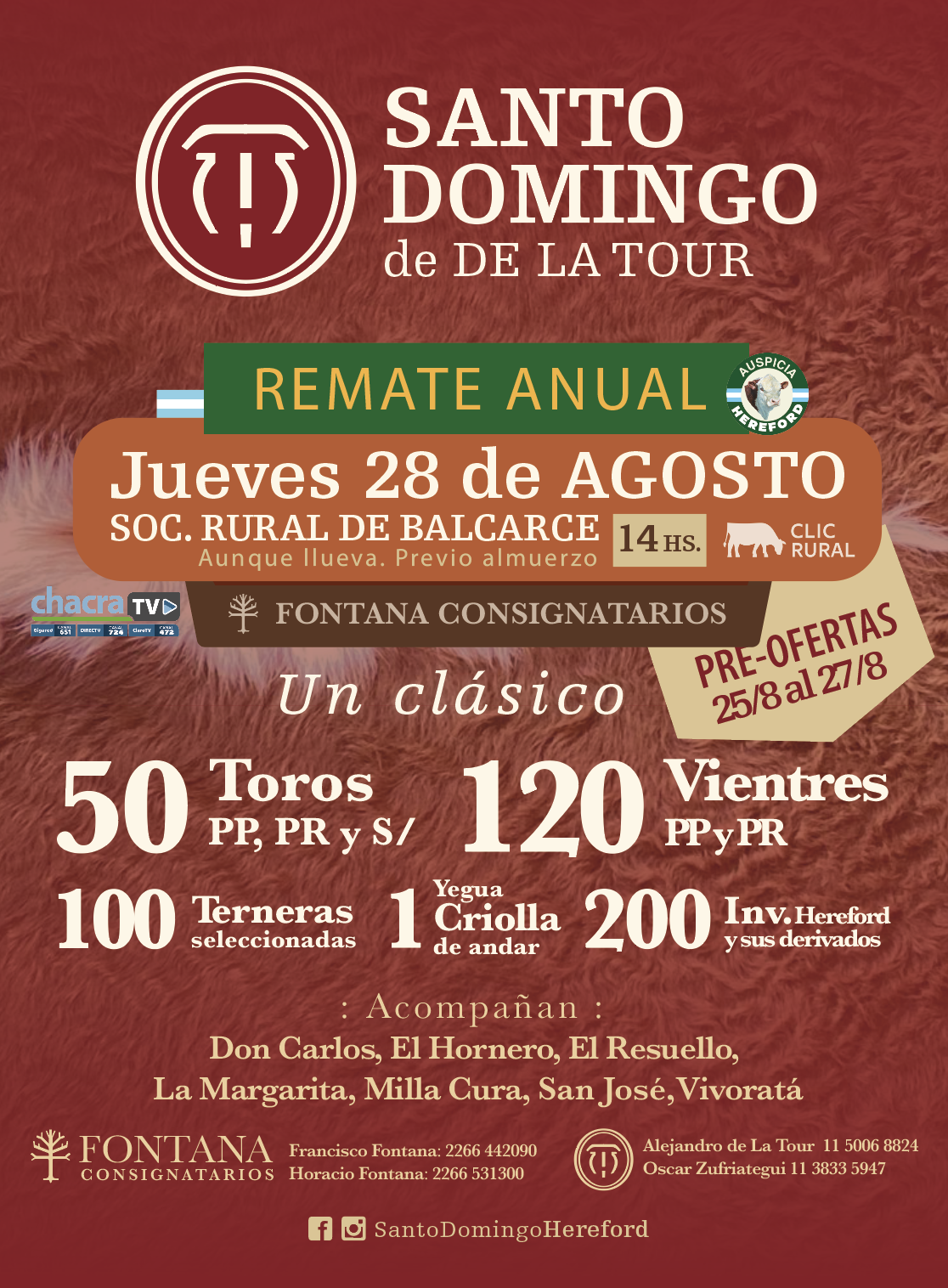 A principios de la década del 1950, el señor Carlos Luis de La Tour d´Auvergne inicia la cría de la raza Hereford en su establecimiento Santo Domingo. Dada la necesidad de abastecer con toros otros establecimientos familiares, que habían sustituido la raza Shorthorn por la Hereford, en Santo Domingo se comenzó con la producción de toros ingresando en el programa Puro Registrado que lleva la Asociación Argentina Criadores de Hereford comenzando una larga relación con la raza y su asociación directiva, relación que se mantiene más vigente que nunca en la actualidad. Tomando en forma conjunta las sociedades agropecuarias familiares, la familia de La Tour d’Auvergne tiene uno de los rodeos Hereford más importantes del país
